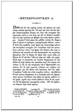 El término meteorología desciende del título Meteorologica, del libro escrito en torno a 340 a. C. por Aristóteles, presentando observaciones y especulaciones acerca del origen de los fenómenos atmosféricos y celestes. La palabra en idioma griego meteoron hace referencia al objeto "altos en el cielo", entre la Tierra y el reino de las estrellas, mientras logos significa "estudio". Una obra similar titulada "Libro de las señales" fue publicada por Teofrasto, un discípulo de Aristóteles; centrado más que todo en la previsión del tiempo sobre la base de las observaciones de los fenómenos meteo.