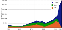 El arribo de los judíos trastornó la demografía de la región por completo. En el censo de 1478 la ciudad solo contaba con 2254 familias, entre musulmanas y cristianas, y tres sinagogas: una romaniota, una italiota y una askenazí; en 1519 ya había 4073 casas, de las que el 56% eran familias judías; para 1613 había 7557 casas y los judíos representaban el 68% y después de llegar en 1492, se construyeron en menos de 8 años 7 nuevas sinagogas: la Cataluña; la Guerouch-Sefarad (Expulsión de España) que agrupaba a judíos de Castilla, Mallorca, Cataluña y Aragón; una siciliana; una calabresa llamada Ismael; y tres portuguesas: Lisboa, Ébora y Portugal.[10][2][11] Las relaciones entre judíos y cristianos se tensaron, ya que estos últimos se habían convertido en una minoría; para 1880 los cristianos ortodoxos no superaba los 15 000 habitantes de un total de 90 000, es decir, poco más del 16%.[12][13]