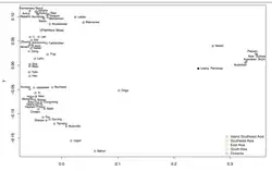 Restos antiguos de cazadores-recolectores del Sudeste Asiático, como un cazador-recolector del Holoceno de la cueva de Leang Panninge, en Sulawesi del Sur, tenían ascendencia tanto del linaje sur-euroasiático (representado por los papúes y los aborígenes australianos) como del linaje este-euroasiático (representado por los asiáticos orientales). El individuo, cazador-recolector, tenía aproximadamente un 50 % de ascendencia asiático oriental basal y se situaba entre los modernos asiáticos orientales y los papúes de Oceanía. Los autores que escribieron sobre el individuo llegaron a la conclusión de que los ancestros relacionados con Asia Oriental se expandieron desde Asia Sudoriental continental hacia Asia Sudoriental marítima mucho antes de lo que se había sugerido anteriormente, en una fecha tan temprana como el 25 000 a. C., mucho antes de la expansión de los grupos austroasiáticos y austronesios.[33]