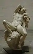La culminación del desnudo renacentista se produjo en la obra de Miguel Ángel, para el que el cuerpo humano desnudo tenía un carácter divino que le otorgaba una dignidad inigualable en cualquier otro desnudo contemporáneo. A causa de sus convicciones neoplatónicas, idealizó de manera extrema la emoción que sentía ante la belleza masculina, por lo que la sensualidad de sus desnudos se convierte en algo trascendental, en la expresión de algo superior e inmaterial, inasible, excelso, puro, infinito. Sus figuras son a la vez dominantes y conmovedoras, de una gran potencia y una gran pasión, de una rotunda vitalidad y una intensa energía espiritual. Incluso sus obras religiosas han perdido el patetismo del sufrimiento inherente a la figura de Cristo crucificado para mostrar al Salvador con una serenidad espiritual que genera compasión más por su belleza que por su dolor, como en la Piedad del Vaticano (1498-1499).[80] Sus primeros dibujos de desnudo muestran la vivacidad de sus articulaciones nerviosas, alejadas ya de los suaves contornos clásicos, con un rico modelado alejado de cualquier proporción o esquema geométrico. Su anatomía es nudosa y apretada, dinámica, donde destaca el espesor del torso, con músculos marcados y contornos macizos, exagerando los efectos de torsión y las figuras en escorzo, como en el Baco ebrio (1496-1497), una de sus primeras grandes esculturas. El David (1501-1504) de Florencia conserva todavía el aire apolíneo de un clasicismo equilibrado, pero interpretado de forma personal, donde el torso puede parecer el de una estatua griega, pero la desproporción de cabeza y miembros denota tensión, y su expresión desafiante se aleja del ethos clásico. Igualmente sucede con la expresión dramática de sus Esclavos del Louvre (Esclavo moribundo y Esclavo heroico, 1513), que recuerdan las figuras de nióbidas del arte helenístico, y denotan la influencia del Laocoonte (Miguel Ángel fue uno de los primeros en ver el grupo escultórico, desenterrado en 1506 cerca de San Pietro in Vincoli). De igual manera, sus figuras para las tumbas de los Médicis (1524) recuerdan a obras griegas: las masculinas (El Día y El Crepúsculo) al Torso del Belvedere, y las femeninas (La Aurora y La Noche) a la Ariadna del Vaticano.[81]