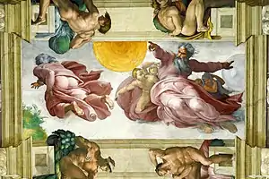 Posteriormente, su idea de una anatomía rotunda y vibrante, pero cargada de intensidad emocional, se plasmó en su Adán de la Capilla Sixtina (1508-1512), que recuerda al Dioniso del frontón del Partenón, pero con una carga vital muy alejada de la armoniosa escultura fidiana. De igual manera, las figuras de los atletas (llamados por lo general simplemente ignudi, «desnudos») en el techo de la Sixtina tienen el equilibrio de la energía atlética junto a la trascendencia de su misión sagrada —representan las almas de los profetas bíblicos—, ejerciendo de forma armoniosa su papel mediador entre el mundo físico y el espiritual, por lo que su belleza física es reflejo de la perfección divina. En otras escenas como el Diluvio universal (1509) también muestra unas figuras vigorosas cuya potencia física trasluce la fortaleza espiritual. La Creación de Eva (1509-1510) presenta una figura femenina rotunda, vigorosa, de contornos muy marcados. Por otro lado, el Cristo del Juicio Final (1536-1541) tiene la solemnidad de un Apolo entendido como sol justitiae, pero con una rotundidad —patente en su torso casi cuadrado— ya plenamente alejada de los cánones clásicos. Su representación de Jesús no es ya la típica figura barbada de tradición bizantina, sino la efigie de un dios olímpico o de un rey helenístico, más cercana a Alejandro Magno que a un carpintero judío, con una complexión más atlética que la que cabría esperar del místico asceta cristiano.[82] En sus últimas obras, las tres piedades (la de Palestrina, la del Duomo y la Piedad Rondanini), abandonó por completo el ideal de belleza física, con figuras distorsionadas (Palestrina), angulosas (Duomo) o de un esquematismo cercano al gótico (Rondanini).[83]