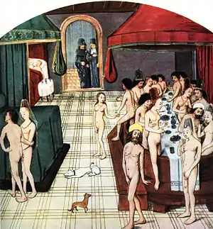 En sus inicios, el cristianismo —todavía bajo una fuerte influencia judía— había prohibido no solo el desnudo, sino casi cualquier imagen de figura humana, ya que suponía una transgresión del segundo mandamiento, y condenaba los ídolos paganos como morada de demonios. El hecho de que muchos dioses paganos estuviesen representados en pintura y escultura de forma humana, y en muchas ocasiones desnudos, hizo que los primitivos cristianos identificasen el desnudo con la idolatría pagana, sino veían directamente una vinculación diabólica. Sin embargo, el fin del paganismo y la asimilación de la filosofía neoplatónica por la moral cristiana hizo que se aceptase el cuerpo como receptáculo del espíritu, y la desnudez como un estado degradado del ser humano, pero natural y aceptable. Aun así, el arte medieval perdió por completo el concepto de belleza corporal inherente al arte clásico, y cuando era representado —en los pasajes bíblicos que lo requerían, como el de Adán y Eva—, eran cuerpos deformes, reducidos a líneas básicas, con los atributos sexuales minimizados, cuerpos poco atractivos, exentos de cualidades estéticas. El período gótico supuso un tímido intento de rehacer la figura humana, más elaborada y partiendo de unas premisas más naturalistas, pero bajo un cierto convencionalismo que sujetaba las formas a una rigidez y una estructura geometrizante que supeditaba el cuerpo al aspecto simbólico de la imagen, siempre bajo premisas de la iconografía cristiana.[45]