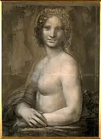 En cambio, Leonardo Da Vinci se alejó de los cánones clásicos, con figuras naturalistas diseñadas según sus amplios estudios de anatomía. En sus inicios se inspiró en las formas enérgicas de Pollaiuolo, y La batalla de Anghiari está influida por La batalla de Cascina de Miguel Ángel. Con posterioridad, su profundización en la anatomía proporcionó a sus figuras un rotundo realismo, donde se vislumbra el interés cientificista, pero al tiempo denotan una cierta actitud heroica, de dignidad moral y humana, que les proporcionaba una serena intensidad vital.[77] Sin embargo, pese a este interés por la anatomía que plasmó en centenares —quizá miles— de dibujos, que se encuentran hoy día esparcidos por múltiples museos y colecciones particulares, en sus cuadros apenas realizó unas pocas representaciones de desnudo,[78] como el Baco (o San Juan Bautista, 1510-1515), o su Leda y el cisne, de la que realizó al menos tres versiones entre 1504 y 1506, y que es la vindicación de la mujer desnuda como símbolo de la vida creadora, y no ya como un ideal inasequible.[nota 5] Para Leonardo, el estudio de la anatomía le servía más para conocer las proporciones de la figura a representar —aunque luego estuviese vestida—, que no como fin en sí mismo; así, por ejemplo, existe un dibujo medio desnuda de la famosa Mona Lisa, La Gioconda (1503), actualmente en el Museo Condé de Chantilly.[79]
