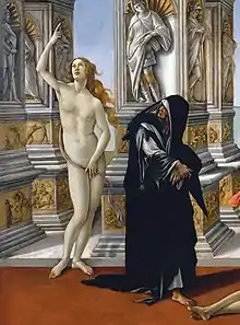Botticelli realizó desnudos muy intelectualizados, de fuerte carga simbólica, relacionado con la escuela neoplatónica de Florencia, que fue la principal responsable de la recuperación del desnudo femenino tras el periodo moralista medieval. Marsilio Ficino, uno de los principales teóricos de la escuela, recuperó la figura de Venus como modelo de virtudes y de exaltación mística, oponiendo dos figuras provenientes de El banquete de Platón, la Venus celestial (Venus Coelestis) y la mundana (Venus Naturalis), que simbolizan lo que hay de divino y de terrenal en la mujer. Este simbolismo fue excelentemente tratado por Botticelli en sus dos principales obras: La primavera (1481-1482) y El nacimiento de Venus (1484). Para ello se inspiró en los pocos restos de obras clásicas que tenía a su alcance, algunos sarcófagos, joyas, relieves, cerámicas y dibujos, y creó un arquetipo de belleza que sería identificado como el ideal clásico de belleza desde el Renacimiento. En La primavera recuperó el género del draperie mouillée, con unas finas telas semitransparentes que dejan entrever el contorno del cuerpo, con un sentido del clasicismo procedente de las pinturas de Pompeya y Herculano o los estucos de Prima Porta y la Villa de Adriano. Sin embargo, Botticelli se alejó del carácter volumétrico del desnudo clásico, con unas figuras frágiles y esbeltas que respondían más al concepto moderno del cuerpo humano, al tiempo que sus rostros son más personales y humanizados que los ideales prototipos clásicos. En El nacimiento de Venus, pintado tras su estancia en Roma, donde realizó sus frescos de la Capilla Sixtina, mostró un más puro clasicismo, gracias a su contacto con las antigüedades romanas presentes en la ciudad de los papas. Así, su Venus está despojada ya de todo ropaje y de cualquier tipo de cortapisa moralista, abandonando definitivamente el arte medieval para entrar de lleno en la modernidad. El tema iconográfico lo tomó de unos versos de la Giostra de Angelo Poliziano,[nota 4] inspirados en un pasaje homérico que, según Plinio, había sido ya pintado por Apeles en su obra Afrodita Anadyomene. Le sirvió de modelo la bella aristócrata Simonetta Vespucci, cuya figura, pese al clasicismo de la composición, responde más a criterios góticos, no tanto en cuanto a proporciones, sino en ritmo y estructura: su forma curva hace que la figura no esté distribuida equitativamente, sino que el peso cae más a la derecha, y el movimiento ondulado de su contorno y sus cabellos da la sensación de estar flotando en el aire. El tipo iconográfico es el de la Venus Púdica, que cubre sus partes íntimas con sus brazos, esquema que repitió parcialmente en la figura de la Verdad de La Calumnia de Apeles, alejada en cambio de todo componente clásico. Otras obras de Botticelli en que aparecen desnudos son: San Sebastián (1474), La historia de Nastagio degli Onesti (1482-1483), Venus y Marte (1483), Piedad con san Jerónimo, san Pablo y san Pedro (1490-1492) y Lamento por Cristo muerto (1492-1495).[73]