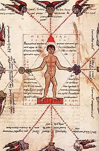 Aunque durante la Edad Media se perdió el estudio de la proporción en el cuerpo humano, este fue objeto de una simbología cosmogónica de aplicaciones matemáticas y estéticas: el homo quadratus. Partiendo del corpus platónico, la cultura medieval consideraba el mundo como un gran animal —y, por tanto, como un ser humano—, mientras que el hombre era concebido como un mundo, un microcosmos dentro del gran cosmos de la Creación. Esta teoría relacionaba la simbología del número cuatro con la naturaleza, que a su vez se aplicaba al arte: existen cuatro puntos cardinales, cuatro estaciones, cuatro fases de la luna, cuatro vientos principales; y cuatro es el número del hombre, teoría que se retrotrae a Vitruvio y su concepción del hombre como cuadrado ideal, correspondiendo la anchura de sus brazos extendidos a su altura.[44]