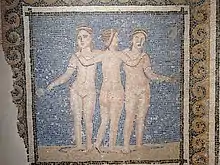 En cuanto a la producción propiamente romana, aun manteniendo la influencia griega, son características las estatuas de emperadores romanos divinizados, desnudos como los dioses griegos, que si bien mantienen un cierto idealismo muestran un mayor estudio del natural en cuanto a las facciones de sus retratos.[36] En pocas obras se percibe algún sello estilístico diferenciado respecto a las griegas, como en la Venus de Cirene (Museo de las Termas, Roma), que muestra un mayor naturalismo anatómico que las figuras griegas, si bien manteniendo la elegancia y sensualidad del desnudo femenino griego. Una original innovación temática fue la de Las Tres Gracias, de la que existen diversas copias (Siena, Louvre), casi todas datables en el siglo I. Es un tema iconográfico proveniente del grupo de cárites (divinidades de la belleza) que acompañaba a Afrodita, generalmente representado con tres hermanas (Eufrósine, Talía y Áglae), cogidas por los brazos y dispuestas dos de ellas en forma frontal y la del centro vuelta hacia atrás. Este tema tuvo mucho éxito en época renacentista y barroca.[37]