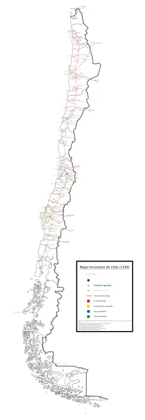 Esta red se extiende desde el extremo norte de Chile, donde se encuentra el ferrocarril Arica-La Paz hasta el norte de la estación La Calera en la región de Valparaíso[5] Sus vías eran de trocha angosta (1 metro).