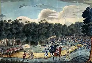 Los enfrentamientos entre los aborígenes y los europeos fueron localizados, ya que los primeros no formaban confederaciones capaces de ofrecer una resistencia sostenida. Como resultado no hubo una sola guerra, sino más bien una serie de compromisos violentos y masacres en todo el continente.[14] Organizada o desorganizada sin embargo, un patrón de guerra de fronteriza surgió con el comienzo de la resistencia aborigen en el siglo XVIII y ha continuado hasta el siglo XX. Esta guerra contradice lo popular y lo académico, a veces como un "mito" de la solución pacífica de Australia. Frente a los colonos la resistencia aborigen a menudo reacciona con violencia, resultando en una serie de masacres indiscriminadas. Entre las más famosas figura la batalla de Pinjarra en Australia Occidental en el año 1834. Pero estos incidentes no fueron sancionados oficialmente, y después de la masacre de Myall Creek en Nueva Gales del Sur en el año 1838, siete europeos fueron ahorcados por su participación en los asesinatos.[15] Sin embargo en Tasmania, en la llamada Guerra Negra, también conocida como Genocidio de Tasmania, que se libró entre el año 1828 y el año 1832, la intención era la de expulsar a la mayoría de los habitantes nativos de la isla a una serie de penínsulas aisladas. A pesar de que se inició con el fracaso de los británicos finalmente resultó con bajas considerables entre la población nativa y su rendición.[16][17]