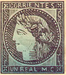 Para el grabado de la viñeta, Coni contactó a un inmigrante francés, Matías Pipet, que oficiaba de panadero, pero que había sido aprendiz de grabador en su país natal. Circuló desde el 21 de agosto de 1856 hasta el año 1880, fecha en la cual los servicios postales fueron nacionalizados. Este primer sello mostraba la imagen de la diosa griega Ceres y estaba impreso con tinta negra sobre papel de seda.[2]