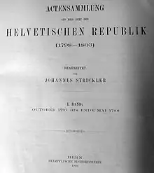 En este período también empieza el estudio de la historia del derecho en Suiza. Desde1898 y la aparición del Libro de Autoridades de la legislación suiza (que continúa apareciendo hasta principios del siglo XXI bajo el nombre de Recopilación sistemática del derecho federal[42]) por la Sociedad Suiza de Juristas, numerosas obras han visto la luz, en particular el System des schweizerischen Privatrechts de Eugen Huber, creador del Código civil en 1893,[43] la Geschichte des neueren schweizerischen Staatsrechts de Edouard His en 1928 o el Tratado de derecho constitucional suizo de Jean-François Aubert en 1967-[nhss 5]