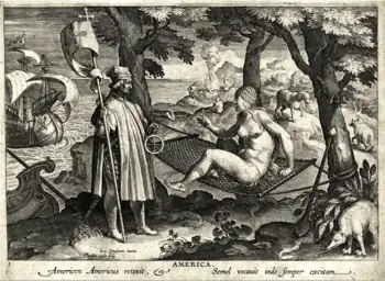 La edad europea de expansión o la edad de foco de exploración en el periodo del punto de vista europeo: patrocinio de corona de viajes de exploración, contactos tempranos con indigenous pueblos, y el establecimiento de poblamientos europeos.[42] había un spate de publicaciones que aparecidos para coincidir con el 500.º aniversario del 1492 viaje de Colón. Un número de contribuciones importantes publicó más temprano incluir el dos-volumen Primeras Imágenes de América: El Impacto del Nuevo Mundo en el Viejo.[43] Hugh Honor es fantásticamente ilustró La Tierra Dorada Nueva: Imágenes europeas de América de los descubrimientos a los Tiempos Presentes incluye muchos imágenes alegóricas de "América" como befeathered, semidesnudo denizen del "Nuevo Mundo", el cual empezó aparecer en Europa en el mid-decimosexto siglo.[44]