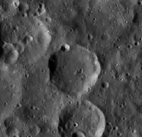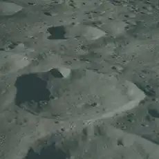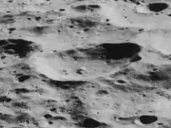 ![]() Cráter lunar Hoffmeister (centro-abajo). Imagen desde el Apolo 16 a 109 km de altura. | ||