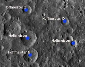 Se trata de un cráter algo erosionado, con Hoffmeister N unido al borde sur. Un pequeño cráter con un alto albedo se encuentra en el borde común entre Hoffmeister y este cráter satélite. Otro pequeño cráter también se localiza en el borde noroeste de Hoffmeister. El suelo de la plataforma interior carece de rasgos significativos.