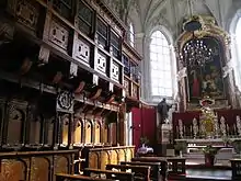 El altar actual fue diseñado en 1755 por el arquitecto vienés Nikolaus Pacassi. Está decorado con una crucifixión del pintor vienés Johann Carl Auerbach y estatuas de bronce de los santos Francisco de Asís y Teresa de Ávila del escultor Balthasar Moll de Innsbruck (1768). El órgano renacentista (1560) es obra de Jörg Ebert de Ravensburg y ha sido descrito como uno de los cinco órganos más famosos en el mundo. Domenico Pozzo de Milán pintó los paneles del órgano.