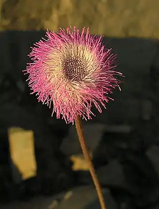 Las plantas de este género sólo tienen disco (sin rayos florales) y los pétalos son de color blanco, ligeramente amarillento blanco, rosa o morado (nunca de un completo color amarillo).[4]