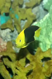 De adulto, la coloración base de la cabeza y parte anterior del cuerpo es amarilla. La aleta dorsal y el frontal de la anal son negras, la caudal es totalmente amarilla.[7] La mayor parte del cuerpo es negra. Los bordes de la dorsal y anal en color rojizo y con un submargen en amarillo. Tiene la parte superior e inferior del iris en azul claro, y los labios, con frecuencia, son azul marino. Las aletas pectorales y las pélvicas son amarillas.