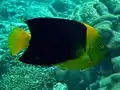 Los especímenes jóvenes tienen la coloración enteramente amarilla, y cuentan con un ocelo negro, bordeado por un anillo azul, en la parte posterior y superior del cuerpo. Según van creciendo, el ocelo se va extendiendo, dando lugar a la gran mancha negra que recubre la mayor parte del cuerpo, y aletas dorsal y anal, de los adultos.[8]
