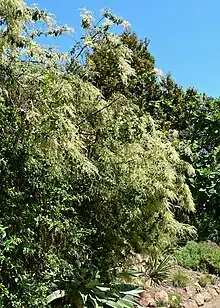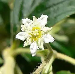 Alcanza de 1 a 3 m de altura. Tallos delgados, un poco recurvados, con corteza suelta, gris oscura a marrón. Hojas pequeñas, ovalesolanceoladas, glabras, de color verde fuerte por la haz, envés seríceo blanquecino con nervios marcados y pelos suaves plateados brillantes; pecíolos cortos, ápice agudo. Inflorescencia en panículas piramidales, de 5 a 15 cm de largo; sépalos de 2 a 3 mm de largo, con pelos blancos; pétalos blancos ovados, de 2 a 5 mm de longitud. Fruto de 2 cm de longitud[2]