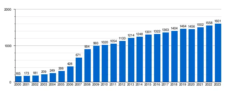 | Gráfica de evolución demográfica de Hontanares de Eresma[13] entre 2000 y 2023 |