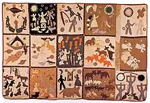 Otras influencias de África Occidental en la espiritualidad Afroamericana se ve en la confección de colchas. Mujeres Afroamericanas hicieron colchas incorporando cruces de África Occidental y la cruz Bakongo del cosmograma Kongo. Por ejemplo, una mujer afroamericana llamada Harriet Powers confeccionó colchas usando el Bakongo y otros símbolos de África Occidental. Una de las colchas de Harriet Powers fue una cruz con cuatro soles mostrando la influencia del cosmograma Kongo en sus edredones. Otros símbolos africanos también fueron vistos en las colchas de Powers. Harriet Powers nació esclava en Georgia en 1837, y los eruditos sugieren que Powers pudo haber sido descendiente de Bakongo o Dahomean.[131][132] Los edredones afroamericanos están influenciados por la fabricación de edredones estadounidenses y los diseños de África occidental. Los símbolos Adinkra y otros símbolos africanos se cosen en telas con propósitos espirituales. Los tejedores de colchas en las comunidades Afroamericanas cosieron bolsas de mojo y colocaron raíces, huesos y otros artículos dentro de las bolsas para su protección. Otro ejemplo, fue Louiza Francis Combs. Louiza Francis Combs nació en Guinea y llegó a los Estados Unidos en 1860. Sus edredones llevaban rasgos de África Occidental de "un patrón de rayas rojas, retazos y dos amplios paneles asimétricos". Este patrón de diseño es similar a los conceptos religiosos del pueblo Mande donde se cree que los espíritus malignos viajan en un camino recto, y para protegerse de ellos las líneas quebradas y las formas fragmentadas se cosen en telas y edredones.[133] Algunos de los significados de los símbolos Africanos tejidos en las colchas, fueron mantenidos en secreto. Los eruditos sugieren que algunas de las mujeres Afroamericanas quienes hicieron edredones podrían haber estado en una sociedad secreta que conservaba los verdaderos significados espirituales de los símbolos que se ven en sus colchas. Solo las principiantes haciendo colchas recibían los significados espirituales de los símbolos Africanos. Algunos de los símbolos mencionan la encrucijada, el cosmograma Kongo y a los ancestros. Ciertos colores son usados en colchas para protegerse del mal e invocar espíritus ancestrales. Eruditos entrevistaron a una tejedora de colchas Afroamericana en Oregón y encontraron inspiración Yoruba en sus edredones. Sus colchas lucían similares a los patrones de regalía de Eggun del pueblo Yoruba en África Occidental, donde ella incorporó "técnicas de rayado que rinden homenaje a sus ancestros"[134]