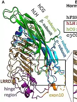 La hormona luteinizante humana (hLH) y la gonadotropina coriónica (hCG) actúan sobre el mismo receptor (LH/CG-R).[7]