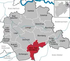 Se encuentra ubicado al este del estado, en la región de Detmold, en el bosque Teutónico, a poca distancia al sur de la orilla del río Weser y de la frontera con el estado de Baja Sajonia.