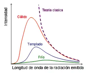 Para un radiador de 1500 K cuando la frecuencia se reduce a cero, el espectro predicho por la fórmula clásica de Rayleigh y Jeans se acerca más y más al espectro observado experimentalmente. Sin embargo, cuando la frecuencia se aumenta a valores de la región ultravioleta del espectro, el resultado teórico clásico difiere enormemente del experimento, ya que la “formula matemática” predice una densidad de energía infinita, cuando la densidad de la energía, a frecuencias muy altas, tiende a cero, lo que se llamó catástrofe ultravioleta.