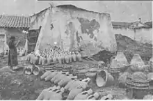 Cántaros, lebrillos y otras piezas en el exterior de un horno de alfarería de Mota del Cuervo (Cuenca).