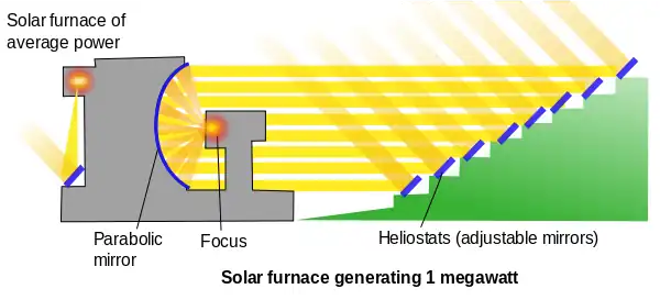 El horno funciona mediante el principio físico de la concentración de los rayos por espejos. Una primera serie de filas de espejos, orientables y situados sobre una ligera cuesta, recoge los rayos solares y los transmite hacia una segunda serie de espejos "concentradores" que forman la enorme parábola en el edificio principal. Los rayos convergen a continuación hacia la zona superior del edificio central que los concentra sobre un objetivo («target» o «diana»), una superficie circular de 40 cm de diámetro. Esto equivale a concentrar la energía de "10 000 soles".
