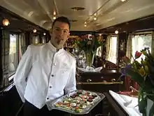 Camarero en un vagón de época de los años 20 sirviendo canapés en una bandeja como parte del servicio de mayordomo