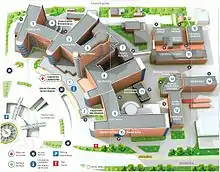 - Pabellón de Servicios, ubicado en la parte delantera del centro (hoy desaparecido) y actualmente situado en la parte trasera del hospital.