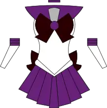 Es la identidad de Hotaru como guerrera Sailor Senshi. Sailor Saturn proviene originalmente del planeta Saturno,[51] y es una de las ocho guerreras del Sistema Solar que siguen a Sailor Moon, la protagonista. Ella finalmente se une al equipo de las guerreras del Sistema Solar Externo,[2][3] quienes desde tiempos antiguos han protegido el Sistema Solar y al reino del Milenio de Plata de amenazas del espacio exterior.[5] Como el resto de las justicieras del equipo, Sailor Saturn lleva un uniforme similar a un sailor fuku[96] y combate el mal por medio de una facultad mística conectada con un planeta o astro específico.[97] El uniforme de Sailor Saturn se destaca por tener el cuello de marinero, la falda y las botas de color morado, además de sus moños de color granate. En su forma inicial, su traje incluso posee más detalles individuales que lo diferencian de los de las demás guerreras; como mangas con forma de pétalos, un broche en forma de estrella, guantes más elaborados, y botas hasta la altura de la rodilla que se atan con lazos.