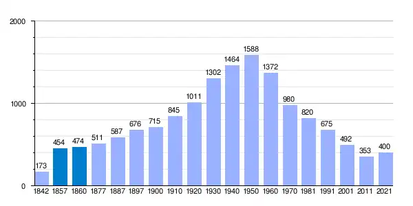 | Gráfica de evolución demográfica de Huélago[2] entre 1842 y 2021 |
