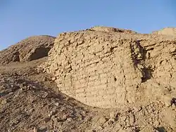 La muralla oeste atraviesa el largo de la plataforma. Actualmente mide 100 metros de longitud, 8 de grosor y 6 de altura. Al parecer, contenía 2 vanos que permitían el acceso de un lado al otro, los cuales se encuentran derrumbados.