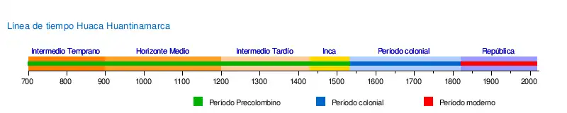 La presente línea de tiempo expone los tres momentos de ocupación de la Huaca Huantinamarca, siendo el prímero el período precolombino (hasta 1532 d. C.), segundo el período colonial (1535 d. C. a 1821 d. C.), y el último el período moderno (1822 d. C. a la actualidad).