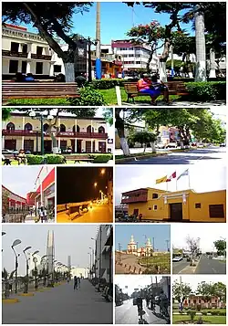 ![]() De arriba en sentido horario: Lado norte de la Plaza de Armas, Avenida Grau, Balcón de Huaura, Iglecia de Chonta, Avenida San Martín, Avenida 28 de Julio, Casona de Luriama, Malecón Rocca, un Conocido centro comercial, Malecón Rocca de noche y Casino Huacho.