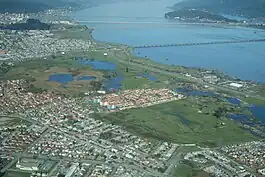Hualpén desde el aire. También se puede observar Concepción, Para distinguir una comuna de otra, basta seguir la prolongación del puente que se encuentra más abajo en el río. En el sector arriba del puente a la izquierda se encuentra Concepción y abajo de la prolongación del puente en el lado izquierdo, Hualpén.