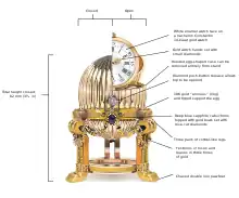 "Huevo de oro con reloj sobre pedestal de diamantes (?) sobre pedestal de oro con 3 zafiros y diamantes talla rosa"