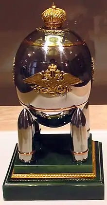 Originalmente, el acero del huevo estaba ennegrecido por todas partes. Sin embargo, no mucho después de su entrega, comenzó a oxidarse y la capa negra se deterioró (una evaluación del huevo realizada por Christie's en 1927 también señaló que los proyectiles de artillería mostraban daños definidos por oxidación). Como resultado, el acero se pulió para detener este proceso y ahora tiene un color plateado espejo. Fue diseñado por uno de los parientes de Carl Fabergé, Gustav Shkilter, y fabricado principalmente en la planta siderúrgica Putilovskii, conocida por la calidad de su acero.[2]