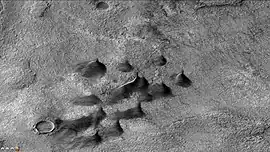 | Cráter Huggins, fotografía de la cámara CTX a bordo del Mars Reconnaissance Orbiter. Borde oeste y noreste del cráter (El norte, hacia la izquierda de la fotografía). |