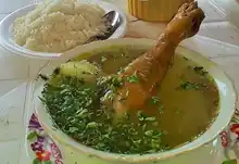 Este plato típico es uno de los más apetecidos en este poblado, ya que este tipo de caldo siempre se lo va encontrar para la hora del almuerzo. Lo más importante en la preparación de este platillo es la gallina criolla, le agrega un sabor muy particular; además de que se le puede agregar otros ingredientes como arroz, zanahoria, alverja, hojas de albahaca fresca, cebolla blanca, entre otros.