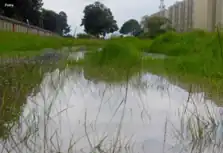 Por otra parte, a partir del seguimiento realizado a este humedal se ha confirmado que las aguas que lo alimentan provienen únicamente de las lluvias y que no recibe ningún tipo de vertimientos, manteniendo una calidad de agua ideal para la proliferación de diferentes formas de vida. En este ecosistema se han registrado poblaciones abundantes de especies que son usadas como indicadores biológicos de la calidad del agua, debido a que tienen una fase de su ciclo de vida con comportamientos acuáticos.[20][21][22][23] Del grupo de los anfibios se encuentra la rana sabanera (Dendropsophus labialis) la cual posee una abundante población y se registra de manera constante; y del grupo de los insectos se han reportado cinco especies de Odonatos. Por último, también se ha reportado la serpiente sabanera (Atractus crassicaudatus) la cual debido a las obras realizadas por las constructoras sobre el humedal ha sido afectada y se han encontrado individuos muertos entre el descapote.[24]
