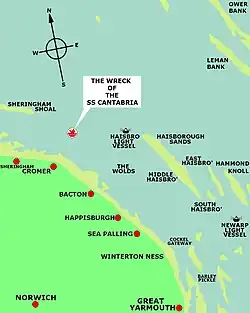 El ataque había sido observado por dos mercantes, el Monkwood británico y otro noruego, que no se atrevieron a rescatar a los náufragos temiendo la reacción del Nadir, que aún estaba en aguas internacionales.[10] El Monkwood envió un aviso a las autoridades navales británicas, y éstas enviaron algunas unidades para impedir que se desatasen hostilidades dentro de sus aguas territoriales.[11] Otro mercante británico, el Pattersonian llegó en respuesta al S.O.S. del Cantabria. Su capitán vio al Nadir moverse hacia uno de los botes del Cantabria, así que decidió poner el Pattersonian entre el buque franquista y los náufragos. Once de los miembros de la tripulación del mercante republicano fueron rescatados por este barco, pero otros veinte fueron capturados por el Nadir. Más de 20 tripulantes del segundo bote salvavidas fueron capturados por el Nadir; Este acto fue juzgado en la Cámara de los Lores como una interferencia ilegal contra los barcos británicos, dado que el buque incursor obstruyó la labor legal de rescatar a los náufragos.[12] La lancha de salvamento llegó de Cromer hacia las 6.30 p. m., cuando todo ya había oscurecido. El Bailey se acercó hasta el Cantabria y evacuó a los últimos tripulantes del mismo, para a continuación retirarse del buque que se estaba hundiendo. Poco después, el buque republicano se hundió completamente. Solo un tripulante, Juan Gil, se hundió junto con el barco.[10]