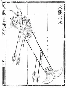 En el Huolongjing también se encuentra la más antigua descripción de un cohete multietapa; este era fue llamado "fuego del dragón usado en el agua" (huo long chu shui), conocido por ser utilizado por la marina de guerra China.[31][32] Era un cohete de dos etapas que tenía cohetes portadores o de refuerzo que activaban automáticamente un número de flechas, que eran cohetes más pequeños, que se disparaban desde el extremo frontal del misil, que tenía la forma de la cabeza de un dragón, abría la boca, hasta que finalmente se extinguía. Este cohete multietapa es considerado por algunos historiadores como el antecesor de las municiones de racimo modernas. Needham dice que el material escrito y la ilustración de este cohete provienen del estrato más antiguo del Huolongjing, que puede fecharse hacia 1300-1350 aproximadamente desde la parte 1 del libro, capítulo 3, página 23.