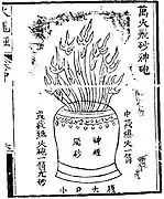 Los dispositivos explosivos incluyen la "bomba divina de arena voladora que libera diez mil fuegos", que consistía en un tubo de pólvora colocado en una olla de barro llena de cal viva, resina y extractos alcohólicos de plantas venenosas.[18]