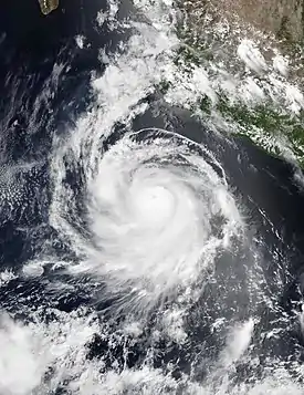 ![]() El Huracán Bonnie en su intensidad máxima sobre aguas abiertas del Pacífico el 5 de julio de 2022 | ||