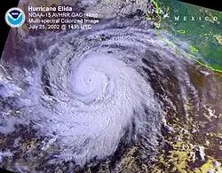 ![]() El huracán Elida convirtiéndose como un poderoso huracán el 24 de julio de 2002 | ||