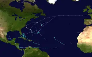 ![]() Mapa resumen de la temporada, que trazan las trayectorias y la intensidad de las tormentas, de acuerdo con la escala de huracanes de Saffir-Simpson (EHSS) | ||
