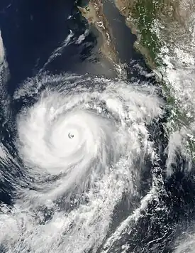 ![]() Vista de imagen del satélite, el huracán Hernán cerca de su intensidad máxima el 1 de septiembre de 2002 cerca de la península de Baja California | ||