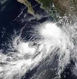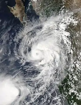![]() Vista de imagen del satélite, el huracán Lorena bordeando Baja California Sur el 20 de septiembre de 2019, con la tormenta tropical Mario visible al suroeste | ||